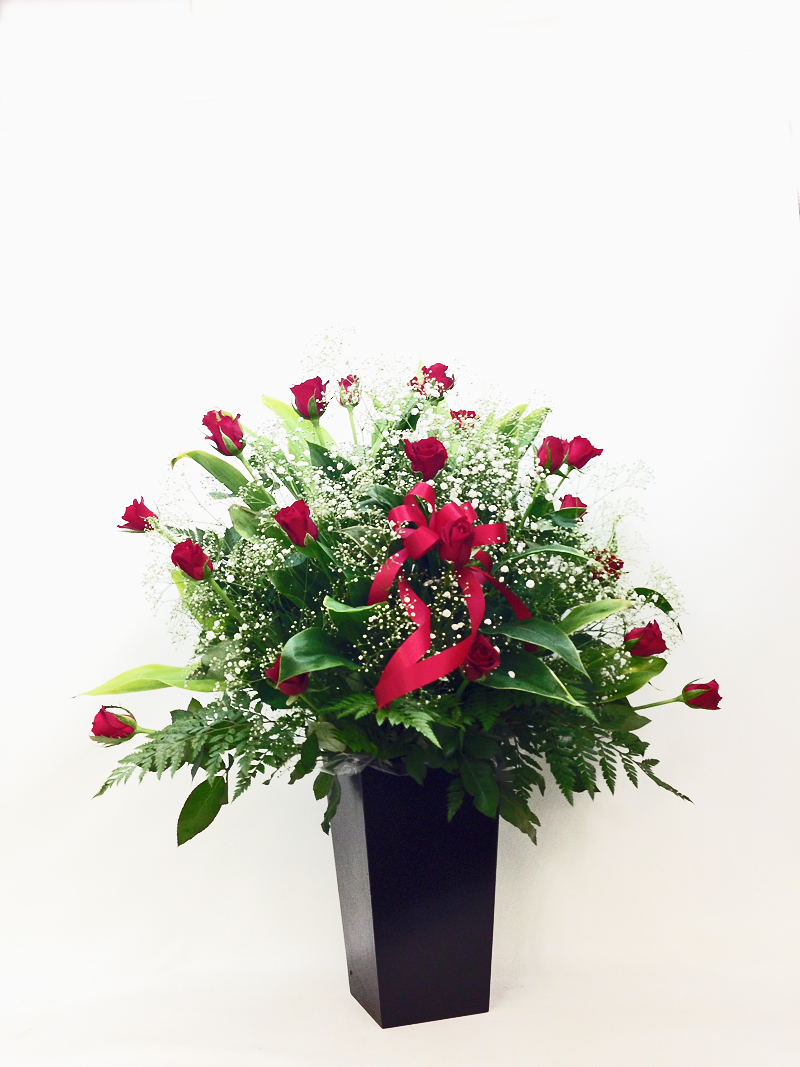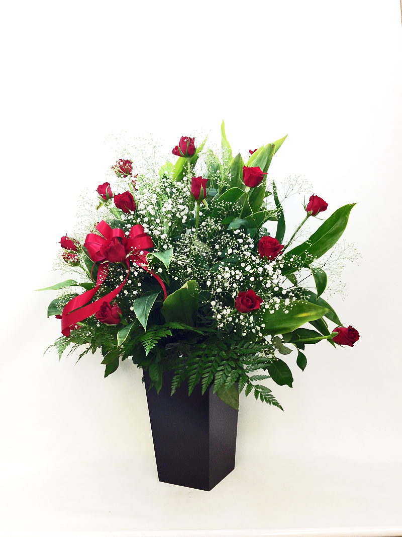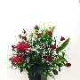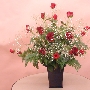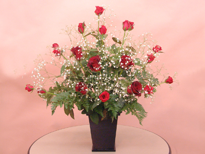 説明:スクエアポットという木の器に盛り付けました。使用した花材も赤バラとカスミ草なので豪華な仕上がりです。赤系フラワーアレンジメント