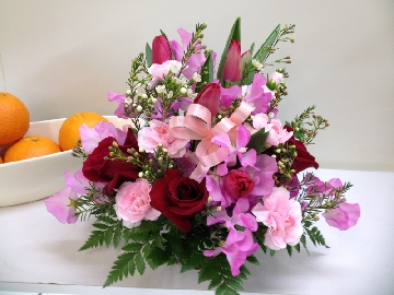 説明:ピンク赤系で、チューリップやスイトピー等の春の花のアレンジメントです。まだ寒い2月少しでも春を感じて頂ければ幸いです。