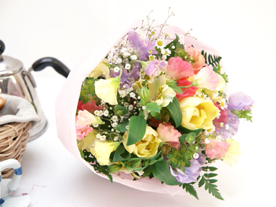 説明:春のお花を使って色とりどりにまとめました。春らしい色合いになってます。