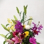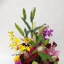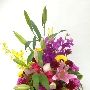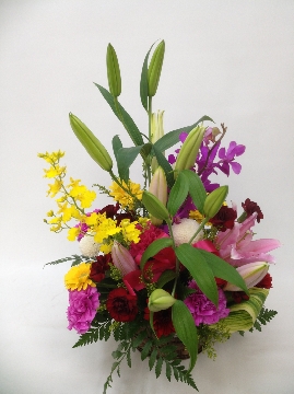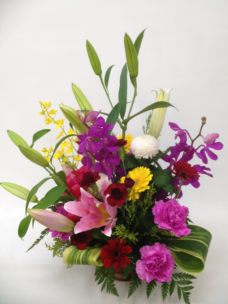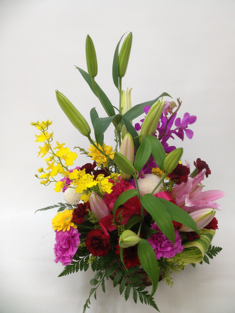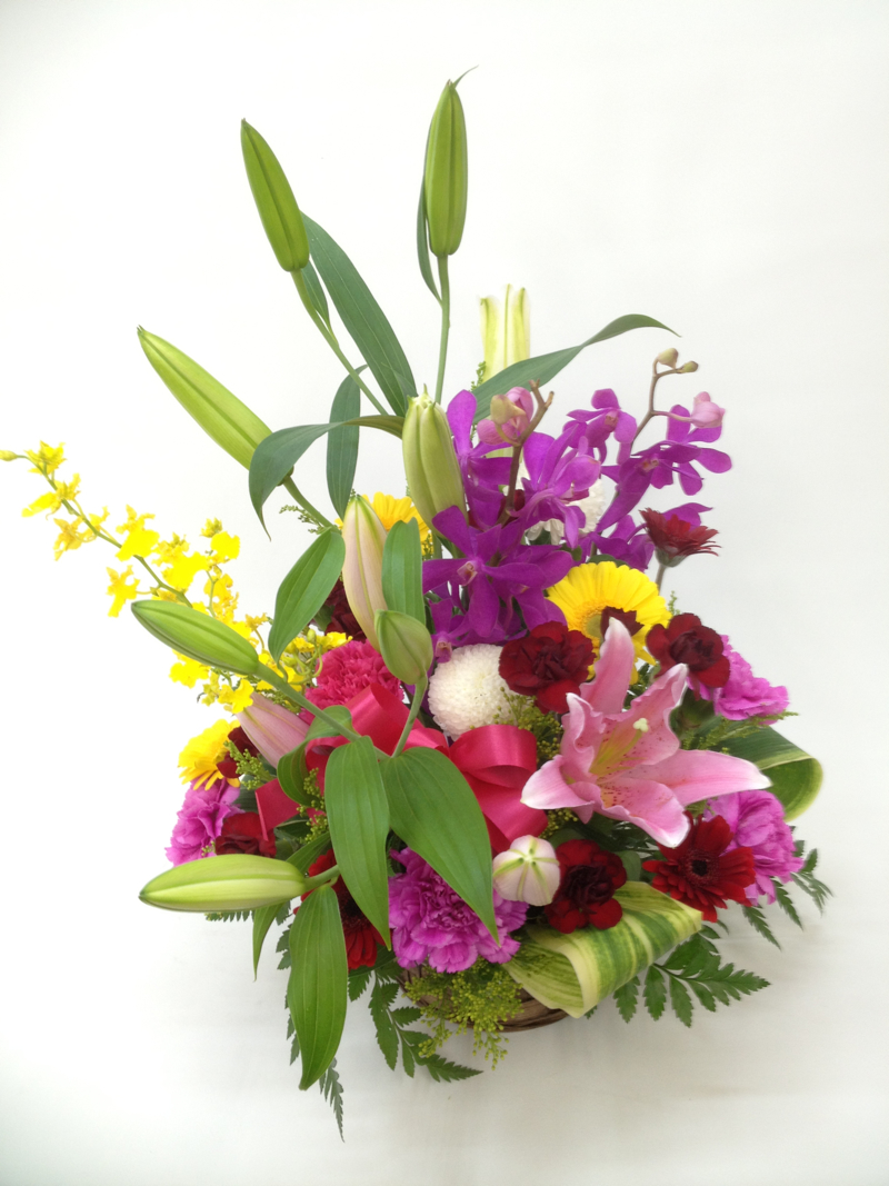 説明:ユリを入れたアレンジメント。蘭の花もいっぱい入って豪華です。開店祝いや移転祝いなどにいかがですか。
