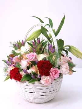 説明:鶏頭(ケイトウ)と竜胆(リンドウ)がメインに入ったフラワーアレンジメントです。オリエンタル白ユリも入っているのでコンパクトな仕上がりでも豪華です。