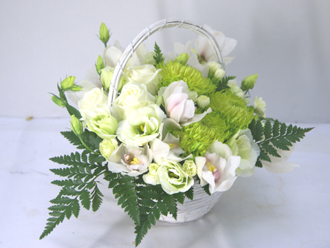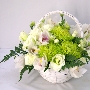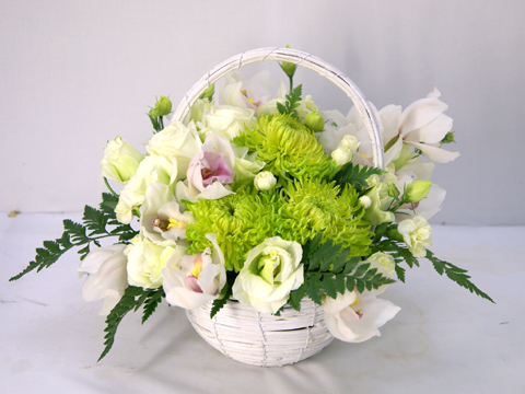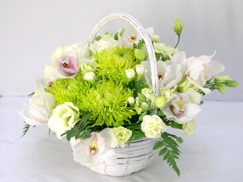 説明:菊とシンビジュームを使用したフラワーアレンジメントです。淡い色合いでコンパクトにまとめました。白系フラワーアレンジメント