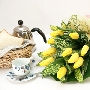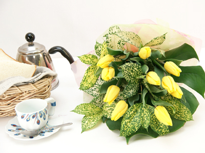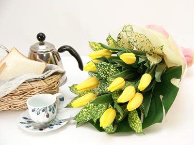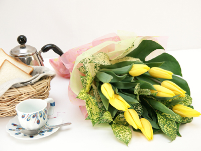 説明:黄色のチューリップだけで作った花束です。春を感じさせる花束ですね。
