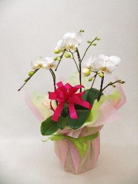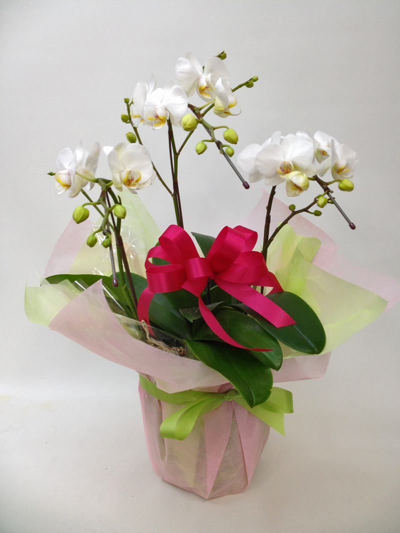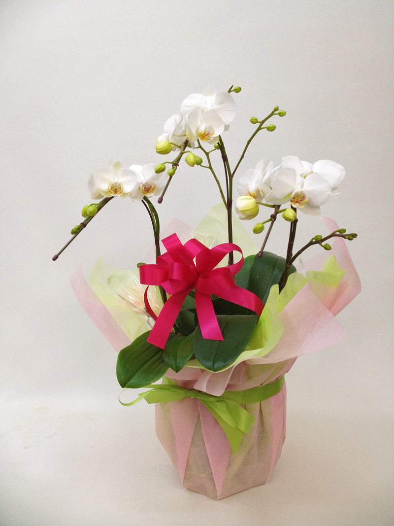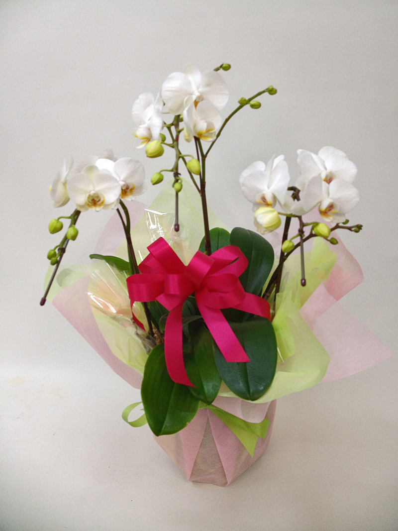 説明:どんなご用途にもぴったりのミディ胡蝶蘭白3本立ちです。お祝い系のラッピングをあしらいました。14時までのご注文は最短で即日出荷対応。更に全国送料無料にてお届けいたします。
