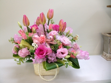 説明:ピンクのチューリップ、ピンクのトルコ桔梗、ピンクのバラなどピンク系の花でまとめました。春はピンクが似合う!ボリュームたっぷりで新登場、即日出荷対応商品です。もちろん全国に送料無料でお届けいたします。
